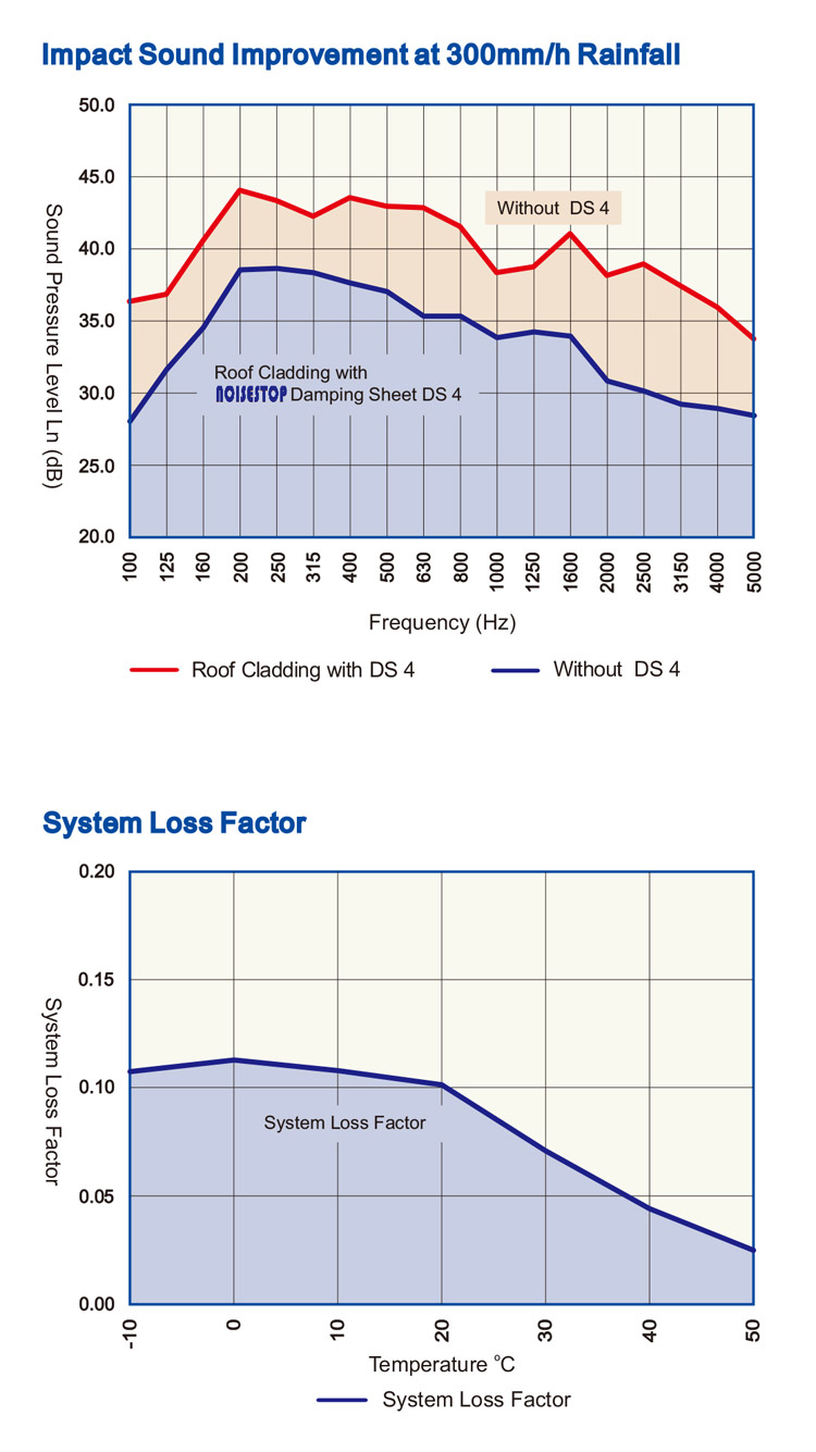 Damping Sheet Impact Sound Improvement at 300mm/h Rainfall thickness, both have a full self-adhesive backing self-adhesive backing and a polythene film facing. It can be used as a layer between two wall to reduce wall resonance and noise vibration. Damping Sheet has significant improvement of rain impact noise when stick it with metal.Damping Sheet are available in three standard