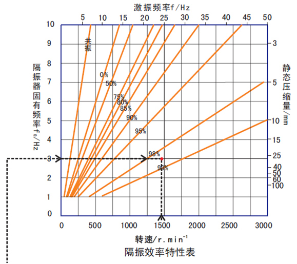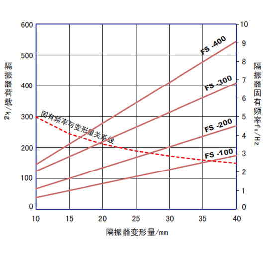 2、由“减振器性能特性表”可得出,当选择用FS-700,隔振器变形量为25毫米,固有频率为30.赫兹。