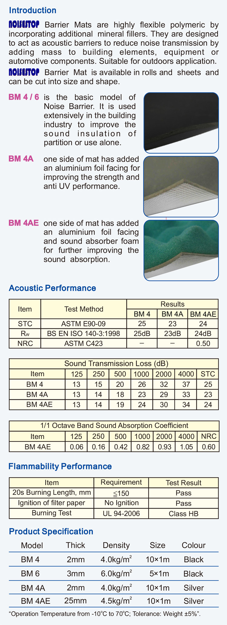 Barrier Mats are highly flexible polymeric by incorporating additional mineral fillers. They are designed to act as acoustic barriers to reduce noise transmission by adding mass to building elements, equipment or automotive components. Suitable for outdoors application. Introduction