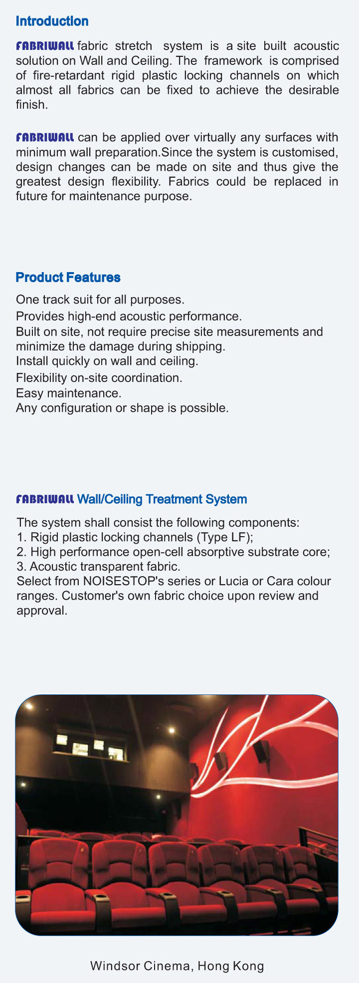 FABRIWALL fabric stretch system is a site built acoustic solution on Wall and Ceiling. The framework is comprised of fire-retardant rigid plastic locking channels on which almost all fabrics can be fixed to achieve the desirable finish.